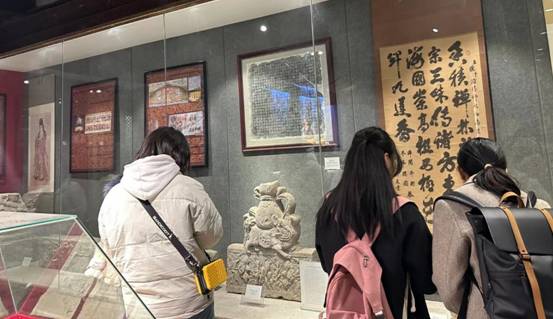 在寺门前,吕双老师首先引导学生们通过手机地图关注香积寺所处的地理空间与秦岭、潏河的相对位置,并介绍了唐代创建香积寺的历史,随后带领学生们进行参观。在吕双老师的引领下,学生们将注意力从寺庙的风景转移到能够展现香积寺历史变化过程的文物上。寺中有洪武二十年(公元1387年)所立石碑,另有唐代、清代、民国不同时期诸多文物展览于寺内展厅中。