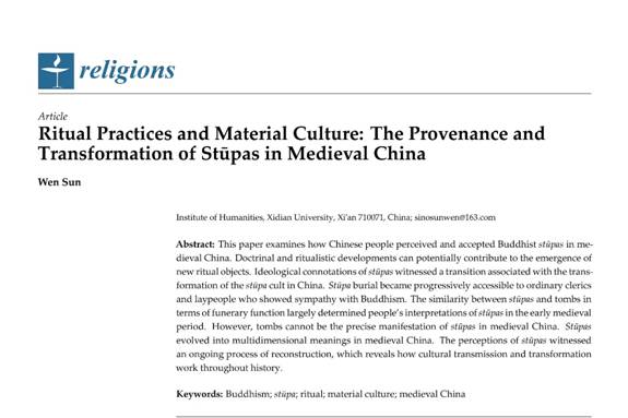 (通讯员 马婧)近日,国际宗教学研究著名期刊Religions(A&HCI, Impact factor 0.8, Citescore 1.1, Journal Rank:Q1 Religious Studies)发表yl23411永利集团官网登录中文系孙雯老师论文“Ritual Practices and Material Culture: The Provenance and Transformation of Stūpas in Medieval China”(《仪式实践与物质文化:中古中国佛塔的缘起与演变》)。