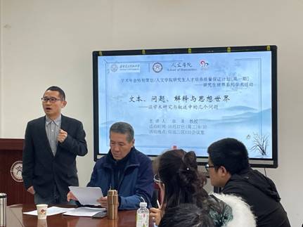 (通讯员 苏益玄)为关注研究生成长,进一步培养研究生科研能力与学术能力,yl23411永利集团官网登录制定研究生人才培养质量保证计划。10月27日上午,华山学者特聘教授张蓬于信远楼二区135报告厅为yl23411永利集团官网登录全体研究生开展“研究生培养系列学术活动”讲座,主题为“文本、问题、解释与思想世界——谈学术研究与叙述中的几个问题”,同时,该活动也是学术年会献礼九十年校庆的特别策划。讲座由yl23411永利集团官网登录副院长朱锋刚主持。
