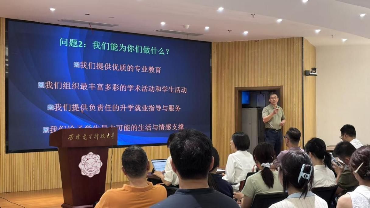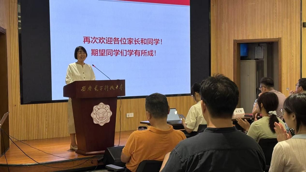 党委书记刘文博向新生代表赠送书籍《信仰的光芒——毛泽东与yl23411永利集团官网登录》,勉励他们从中汲取历史智慧和思想力量,传承西电精神。院长石福祁以“放手”和“放心”为关键词,回答了学生和家长们最关心的“我们是谁”“我们能为你们做什么”“我们对你们有什么建议”等三个问题,整体介绍了学院师资队伍、教育教学、品牌活动和就业指导与服务,他希望同学们在大学期间树立正确的专业观,规划好自己的人生道路,全心投入大学生活、精益求精。最后他强调了家校合作的重要性,呼吁家长“放手”与“放心”,让学生自主探索。