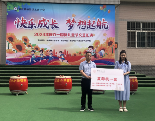 活动现场,yl23411永利集团官网登录院长石福祁在讲话中向小朋友们致以衷心的节日祝福,他勉励同学们在老师们的关怀下多读书、快乐成长、打开未来世界的窗口。希望未来三合小学能和西电携手并进!随后,yl23411永利集团官网登录大四本科生王艺乔捐赠用个人奖学金购买的一台打印机,并以鲁迅先生“无穷的远方,无数的人们,都和我有关”鼓励小朋友们,希望自己传达的这份善意能够像潺潺流水一样不断延续,希望小朋友们将善意留存,将温暖传递。最后,三合小学校长赵光明致开幕词,感谢yl23411永利集团官网登录一如既往的无私捐赠,感谢同学们、老师们的辛勤付出。
