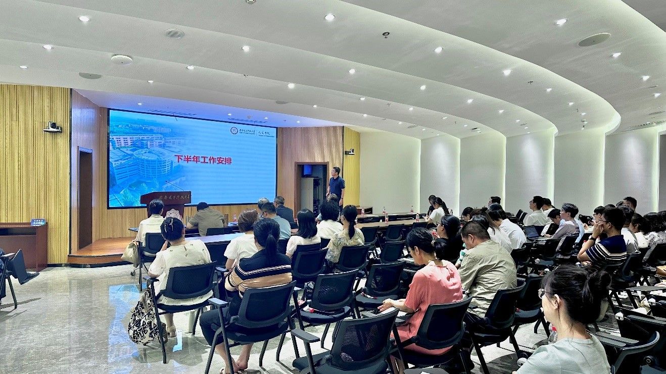 党委书记刘文博在总结讲话中充分肯定了学院上半年取得的成绩,对全体教职工做出的努力表示感谢。就做好学院下半年工作,刘文博提出了三点要求。一是提高政治站位,把思想和行动统一到党中央决策部署和学校党委工作要求上来。要始终坚持以习近平新时代中国特色社会主义思想为指导,深入学习贯彻党的二十届三中全会精神和全国教育大会精神,深刻领悟“两个确立”的决定性意义,增强“四个意识”、坚定“四个自信”、做到“两个维护”。落实好每周三下午政治理论学习制度,学院领导班子成员要深入各支部各系,加强与师生交流,听取意见建议,切实解决实际问题。二是守牢底线红线,将党纪学习教育成果持续转化为推动高质量发展的强大动力。严守课堂教学秩序底线,严肃教学纪律,提高教学质量,涵养良好教风学风。严守师德师风红线,认真落实教育部《新时代教师职业行为十项准则》,构建和谐平等导学关系,严格自我约束、规范职业行为、强化道德自觉。严守意识形态防线,严把教材选用关,规范网上网下行为,不断增强政治敏锐性和政治鉴别力。三是狠抓工作落实,推动学院各项事业迈上新台阶。要以筹备学院第三次党员代表大会为契机,谋划好学院未来发展。要强化科技教育和人文教育协同,优化通识教育课程体系,不断提高学校人才自主培养质量。举办高水平学术活动,进一步提升人文学科影响力。强化有组织科研,产出一批有较大影响力的研究成果,加强师资队伍建设,努力为广大教师创造良好的工作生活环境。
