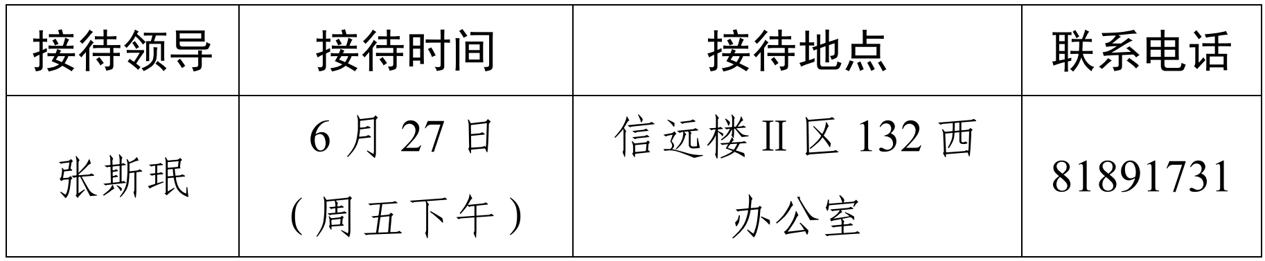 注:学院领导班子接待日主要受理的事项:1.学院人才培养、教学科研、学科建设、教师发展、对外交流、学生管理和服务保障等方面存在的问题与建议;2.反映有关学院重要决策和重要工作事宜的问题;3.涉及师生员工利益的申诉和诉求;4.亟须学院处理的难点问题;5.其他方面的建议和意见。