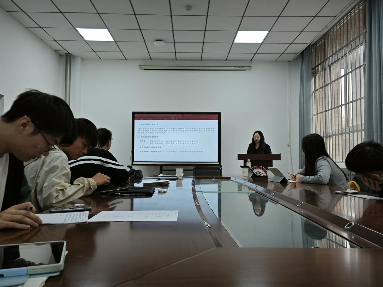 郭超群以“徐复观忧患意识”为题展开阐述,从背景、释义、意义与局限性三方面清晰地介绍了徐复观的忧患意识。首先郭超群以国情为基础,指出郁结困顿的民族与文化和现代性问题在中国的断裂感困境。接下来她从何谓忧患意识出发,阐释了从“忧患”到“忧患意识”的发展,指出徐复观对于忧患意识的考察是置于商周历史转型的背景中加以分析得出的,同时还将其与恐怖、绝望进行区分。在意义与局限方面,郭超群指出在忧患意识下,人的生存、行动的依据由外在转向了内在,并深刻意识到“中国文化是在忧患意识中生长出来的文化。它必定在忧患最深、忧患意识最强的祖国乡土上重新得到发育滋长。”