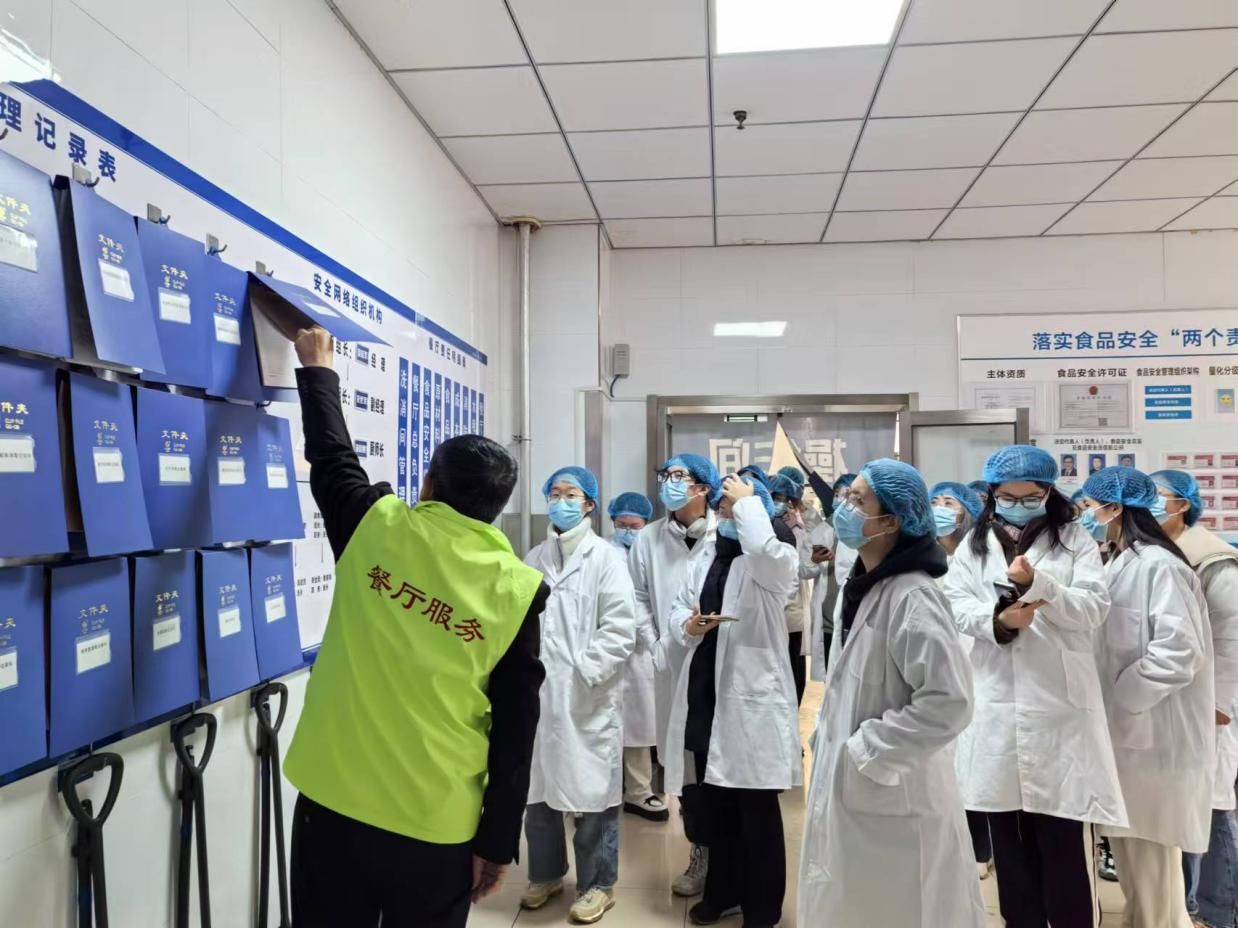 参观开始前同学们在丁香餐厅入口处领取并穿戴好统一的工作服以确保参观过程的安全与规范。同学们在老师的带领下参观了丁香餐厅的各个区域包括烹饪间、备餐间、食材储存区等。参观过程中丁香餐厅一层负责人梁延军向同学们悉心介绍了食材从采买到上餐桌的全流程以及食堂日常运营的规范流程与管理细则。同学们也踊跃提问对食品品质把控与食堂高效管理等方面进行了深入了解。梁延军说到:“餐厅内的食品安全培训是一项极为关键的工作。我们始终将食品安全视作重中之重以切实的行动守护每一位师生的饮食安全让大家吃得安心吃得放心