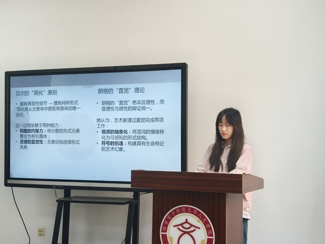 宓子琳以《艺术中的形式与情感——关于克莱夫•贝尔与苏珊•朗格艺术本质的比较研究》为题展开学术汇报,围绕形式与情感、符号与体验这对艺术哲学的核心议题,系统梳理了贝尔的形式主义理论与朗格的符号学美学在艺术本质论上的异同。她指出,两者虽在方法论上分属形式分析与符号阐释的不同路径,却共同指向艺术超越个体经验的普遍性情感表达。这种既异质又互补的理论图景,深刻映射出艺术哲学中形式逻辑与符号表意的永恒张力。在评议环节,刘丙瑞与宓子琳就“符号形式”的哲学内涵展开对话,深化了对艺术符号本体论地位的讨论。