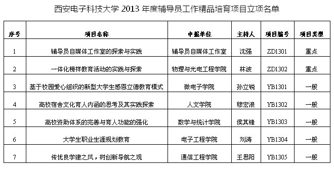 11月4日,yl23411永利集团官网登录公布了2013年度辅导员工作精品培育项目立项名单,yl23411永利集团官网登录辅导员穆宏浪主持的《高校宿舍文化育人内涵的思考及其实践探索》成功立项。