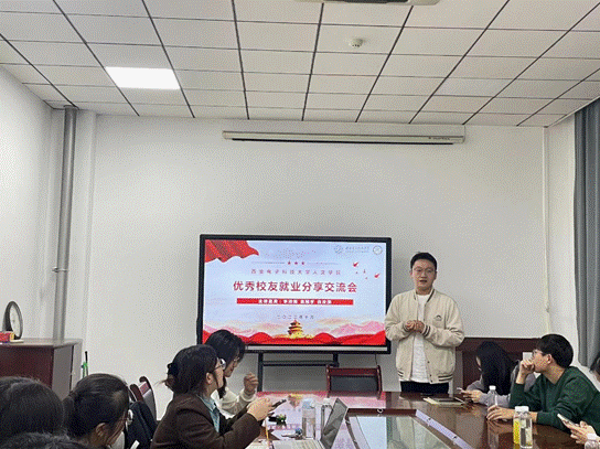2020级哲学专业毕业研究生、“时代之声”研究生宣讲团负责人李诗阳,现为西安建筑科技大学艺术学院2023级本科生辅导员,他用自己的亲身经历向在座学生分享了大学“三问”。他围绕“西电能为我提供什么”“我能在西电做些什么”以及“我还能留下、带走什么”三方面展开分享。首先,李诗阳系统展示了西电在平台优势、教育资源、资金支持、信息化建设等方面能够给予同学们在学习、就业、升学等方面的助力。接着以自身就业历程为依据,强调了在打好基础、搜集信息、选投单位以及准备面试等环节中转变就业思路的重要性。最后,李诗阳表示:“作为一名新时代青年,我们理应挺身担当,为学院的发展贡献自己的微薄之力。”